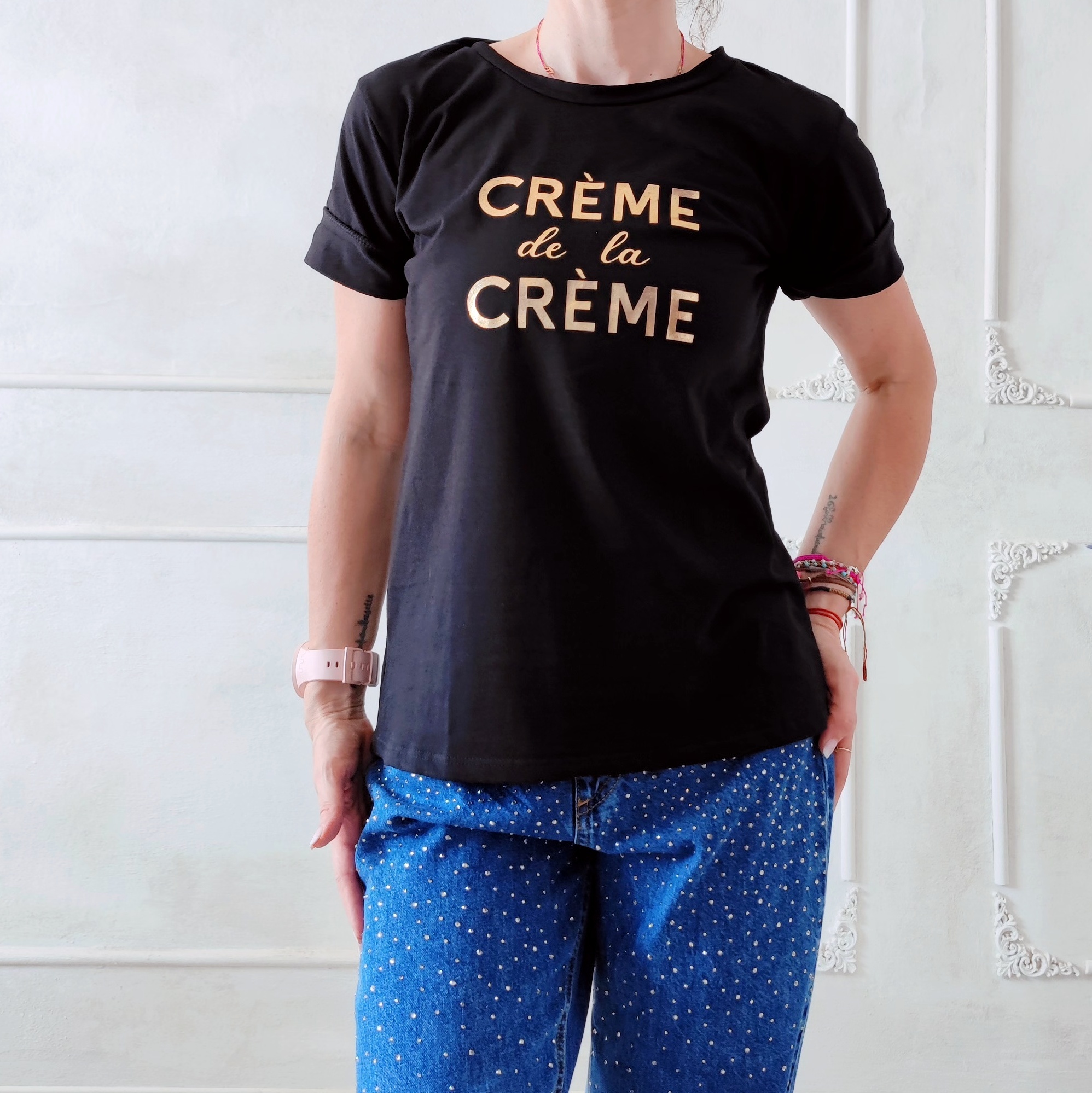 T-shirt 100% cotone elasticizzato con scritta stampata oro .